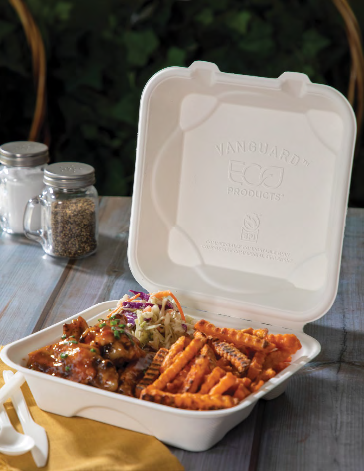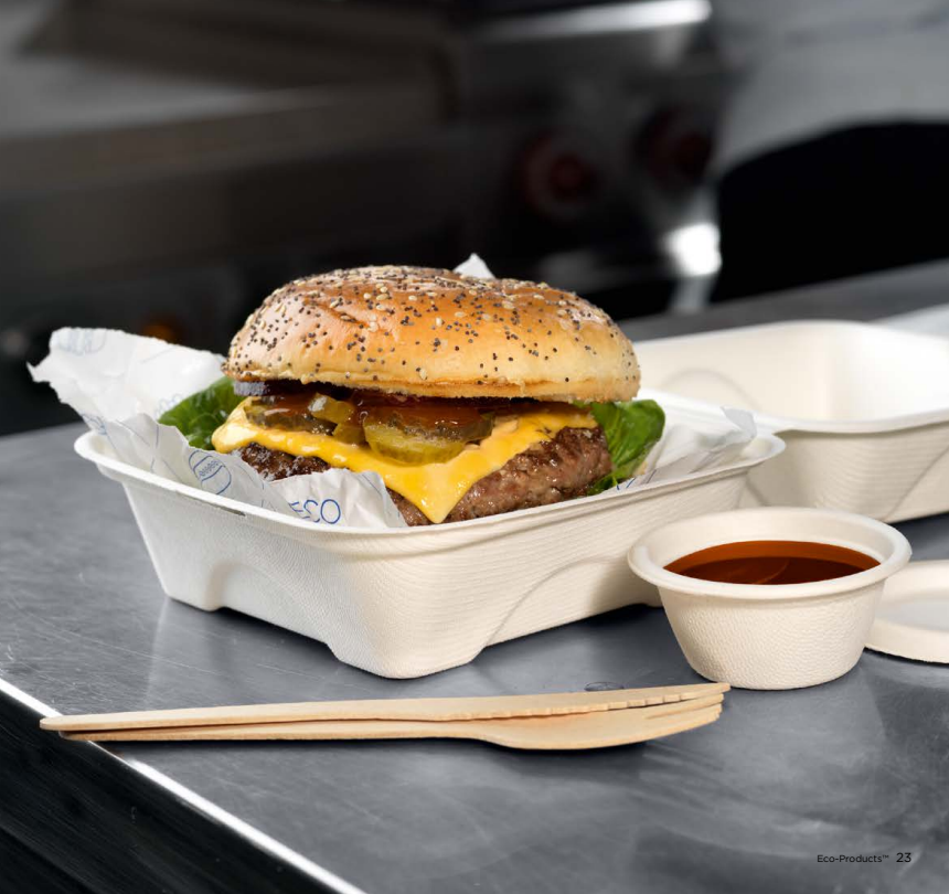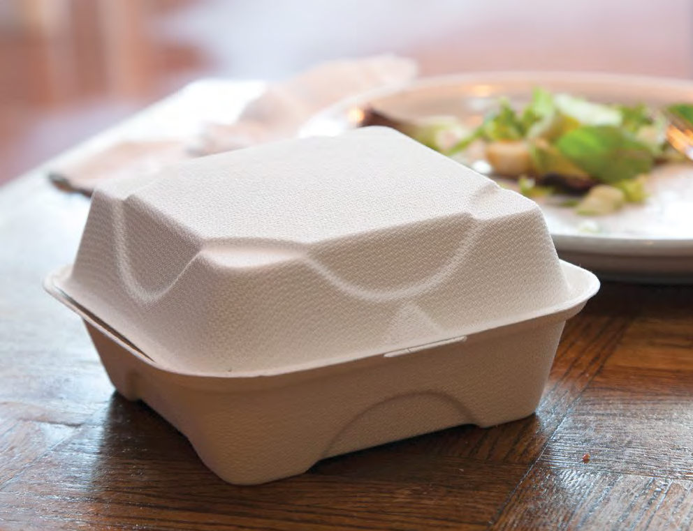 Envase de caña de azúcar, compostable y sostenible, ideal para comida para llevar (hamburguesas, patatas, croquetas,...)